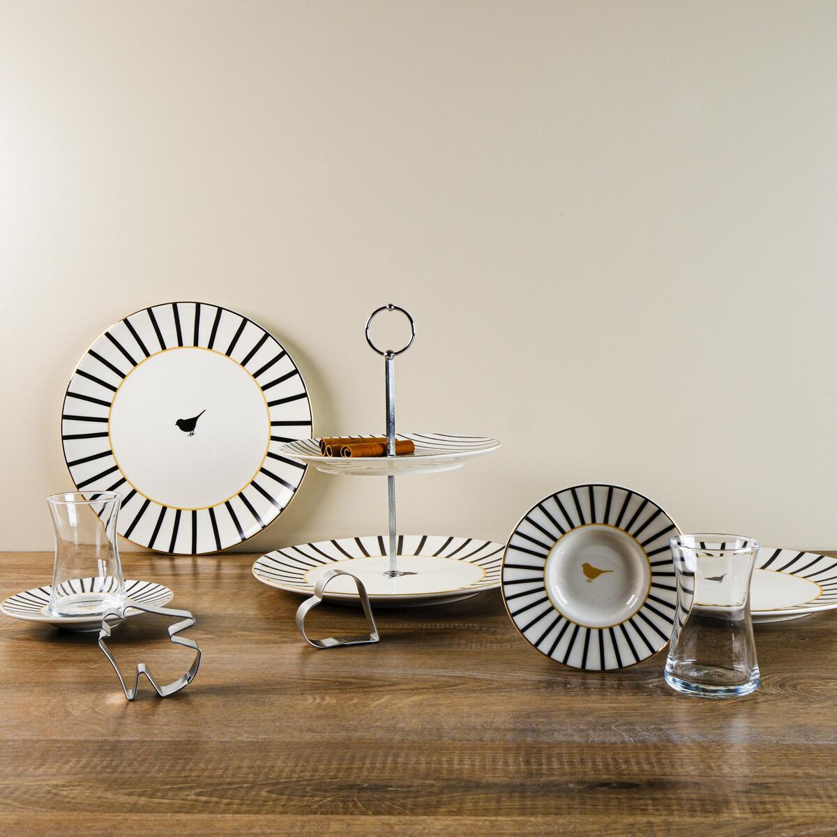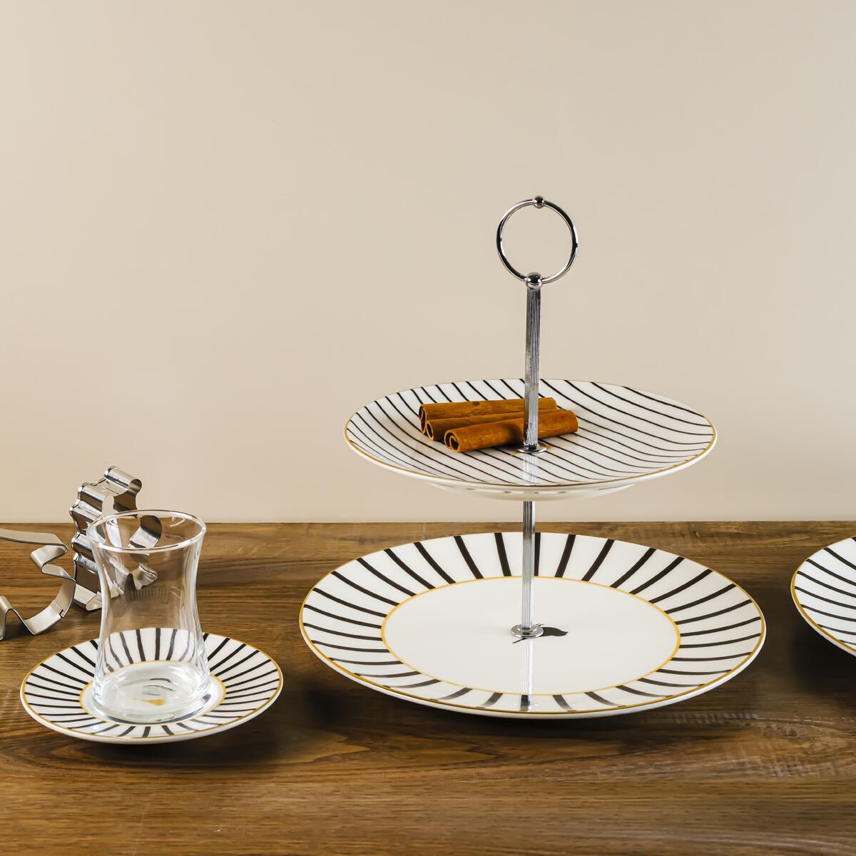 Set içeriğinde bulunan katlı kurabiyelik ile tatlılarınızı sergileyebilir, 6 adet pasta tabağı ile misafirlerinize benzersiz sunumlar hazırlayabilirsiniz.