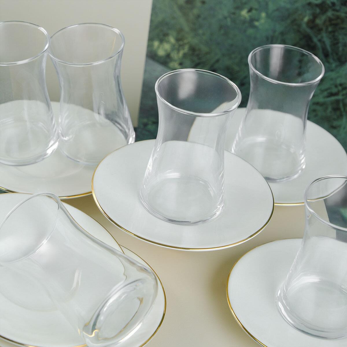 Çay Bardağı Takımı, zarif tasarımı ve altın yaldız detaylarıyla çay keyfinizi bir üst seviyeye taşıyor.
