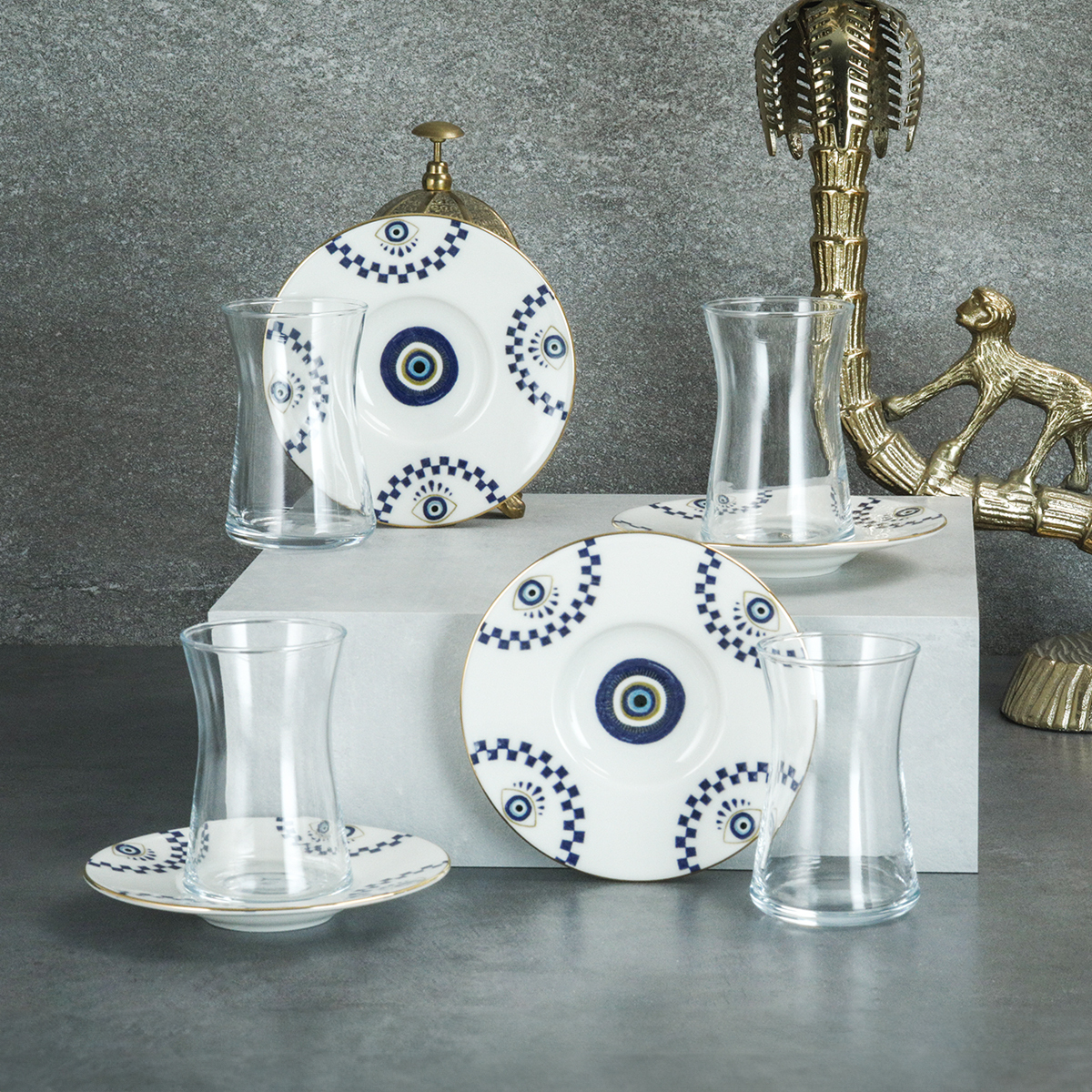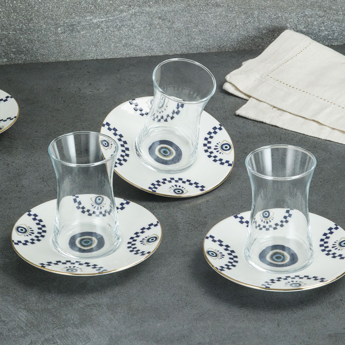Çay Bardağı Takımı, zarif tasarımı ve altın yaldız detaylarıyla çay keyfinizi bir üst seviyeye taşıyor.