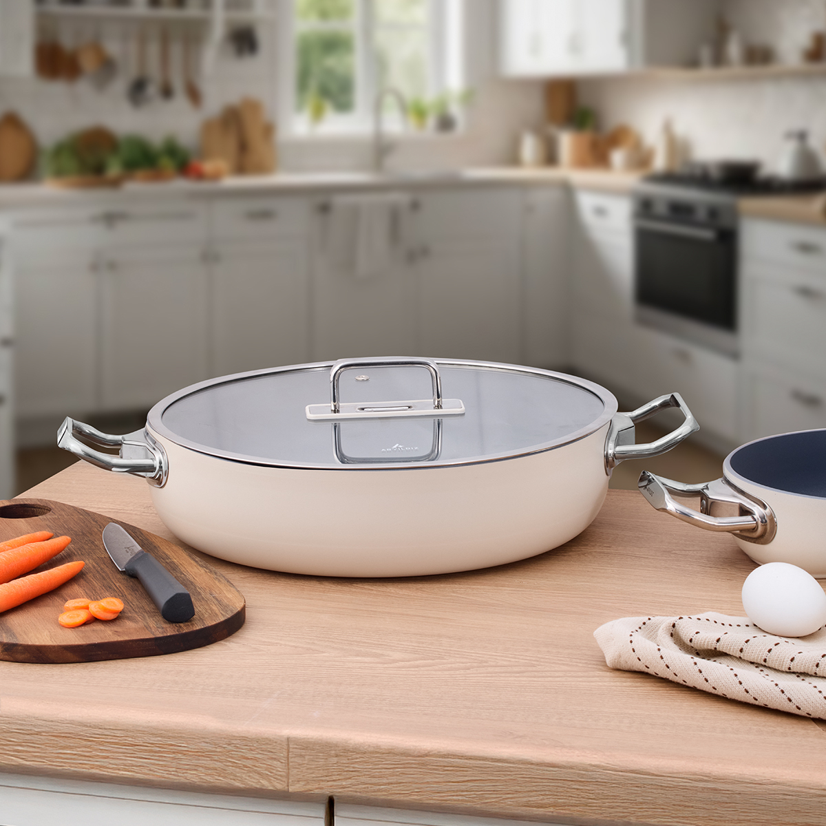 Bu koleksiyondaki her parçanın paslanmaz çelik tutacakları rahat bir tutuş sağlarken, fırında kullanılabilir özellikleriyle yemek pişirme deneyiminizi bir üst seviyeye taşıyor.