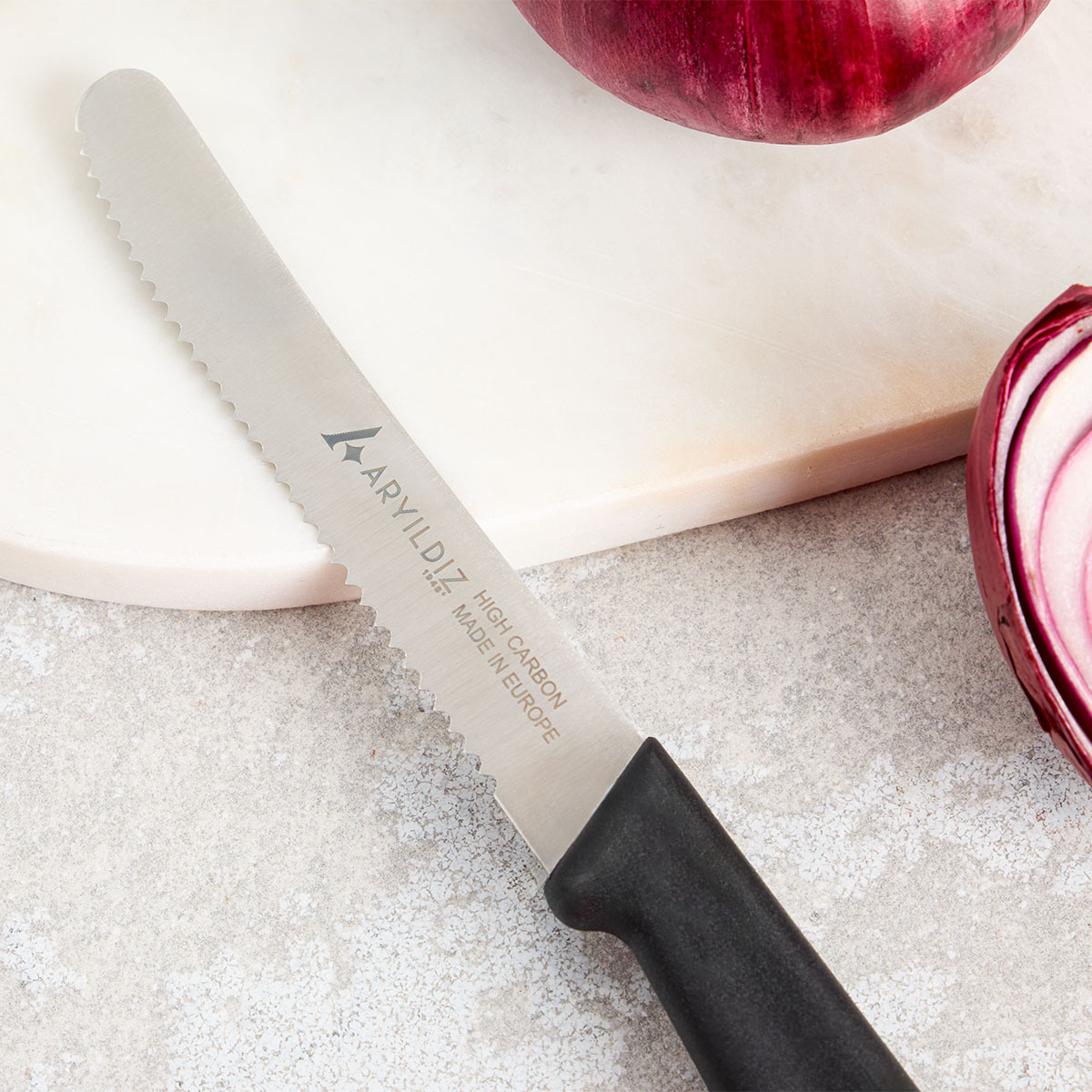 Aryıldız Daily domates bıçağı, mutfakta zarafet ve işlevselliği bir araya getirir. 11 cm uzunluğundaki paslanmaz çelik bıçağı, özellikle domates gibi kabuğu ince ve içi sulu sebzeleri kolayca dilimlemenizi sağlar. İnce ve keskin ucu, meyve ve sebzeleri ezmeden pürüzsüz kesim yapmanıza yardımcı olur.