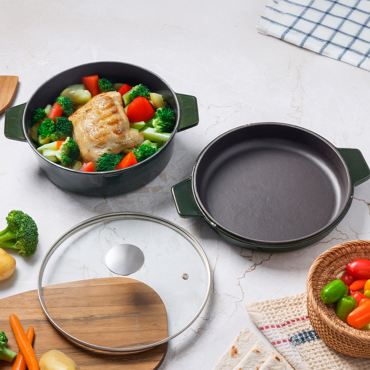 Mutfaklara enerji katan canlı Fesleğen rengi dış yüzeyi, Duo Cast serisinin modern çizgisiyle birleşerek stil sahibi bir görünüm oluşturur.