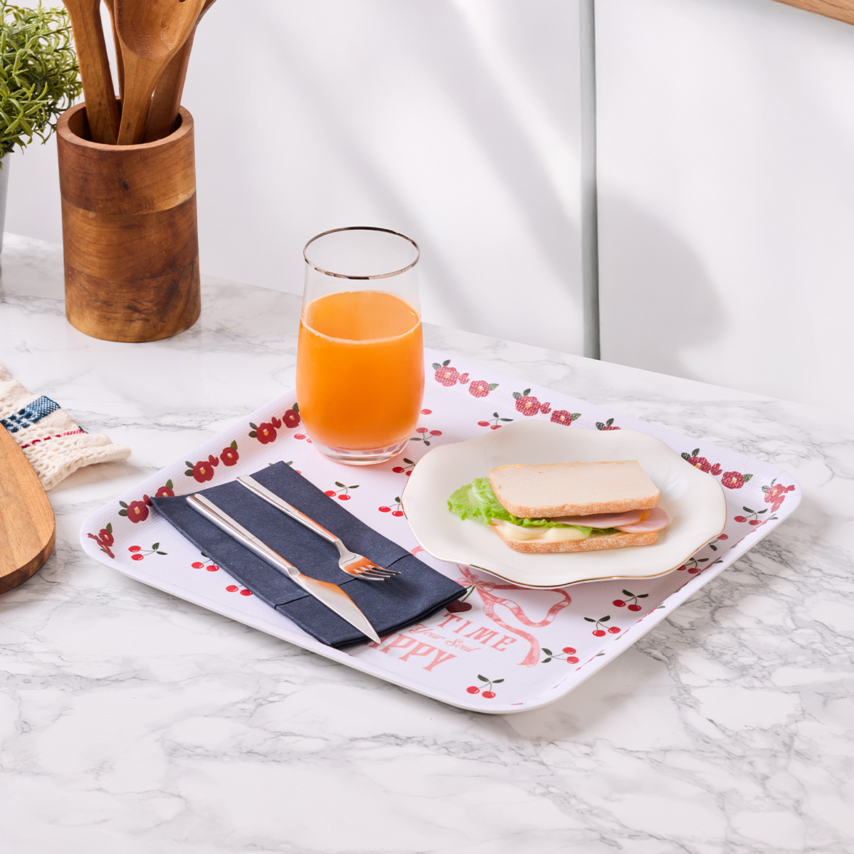 32×32 cm’lik büyük ölçüsü; çay ve kahve servisleri, tatlı tabakları, ikramlıklar ve çoklu sunumlar için geniş ve kullanışlı bir alan sunar. Dengeli yapısı sayesinde servis sırasında güvenli kullanım sağlarken, kare formu ile sunumlarınızda simetrik ve profesyonel bir görünüm oluşturur.
