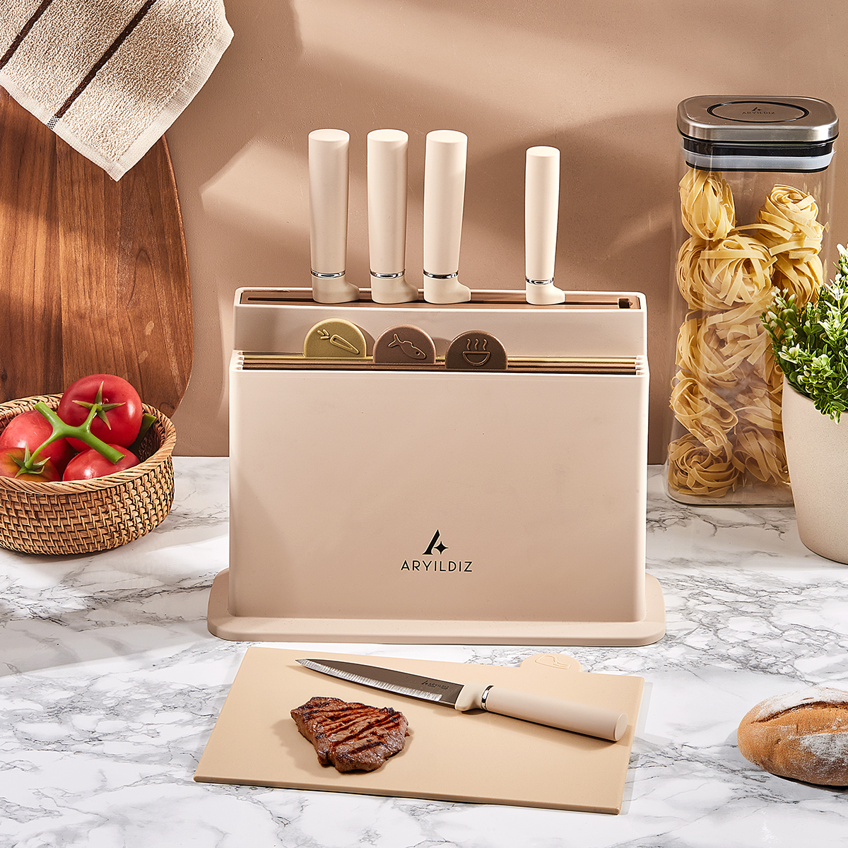 Blok, mutfakta düzen sağlar ve bıçakların güvenli şekilde saklanmasını mümkün kılar.