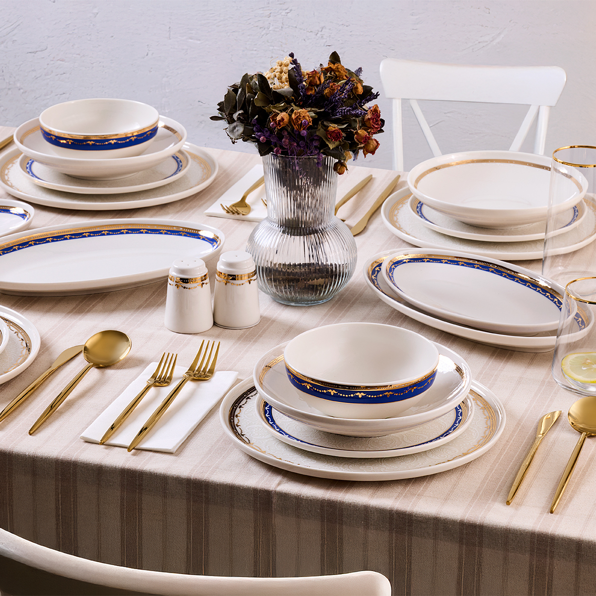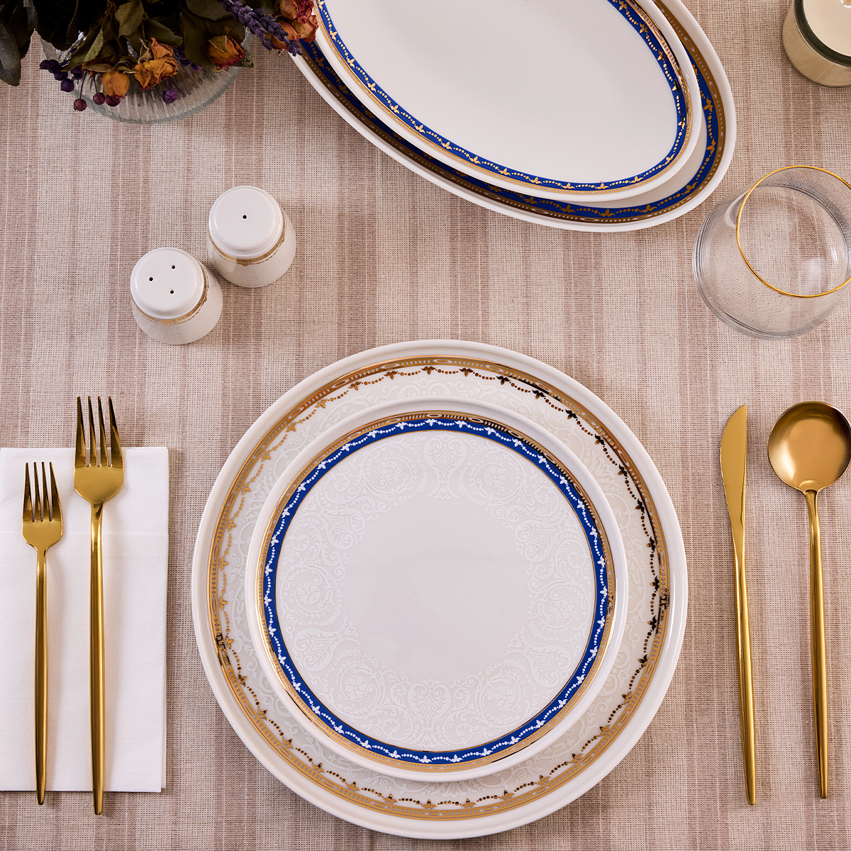 30 Parça Set İçeriği: Yemek tabakları, çorba tabakları, servis tabakları ve diğer tamamlayıcı parçalar ile eksiksiz bir set sunar.