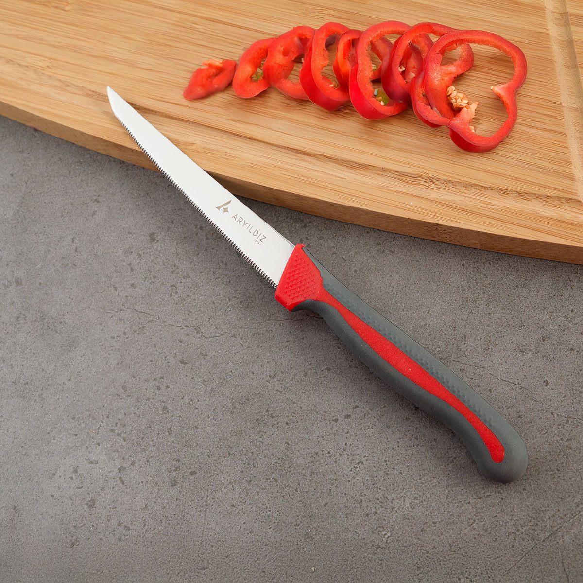 Canlı rengiyle mutfağınıza ferah ve modern bir dokunuş katan Aryıldız Soyma ve Doğrama Bıçağı, hem işlevselliği hem de şık tasarımıyla öne çıkar.