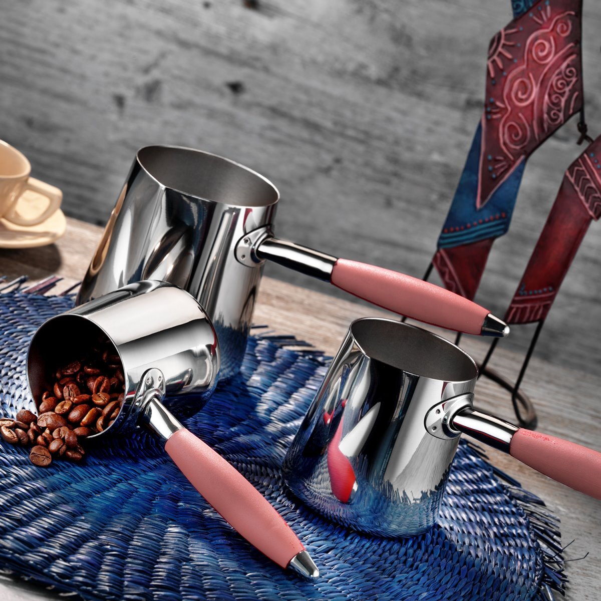 Ar Yıldız Cezve Takımları AISI 304 paslanmaz çelik gövdeden üretilen özel tasarımlara sahiptir.