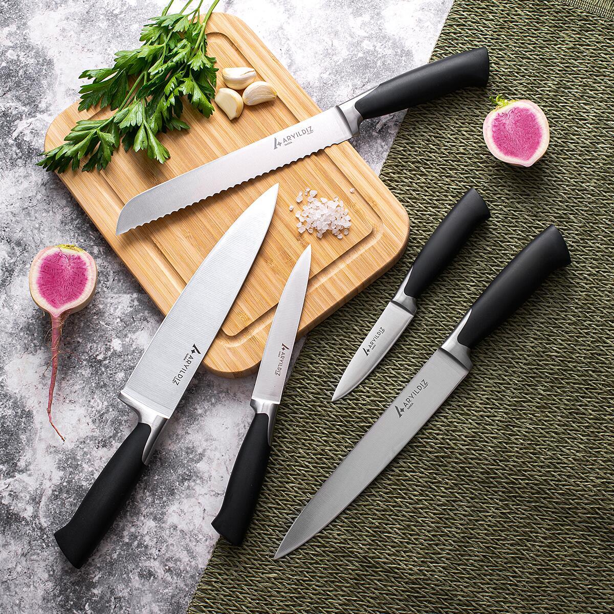 Paslanmaz çelik bıçaklar, ergonomik saplarla birleşerek mükemmel bir kullanım deneyimi sunar."