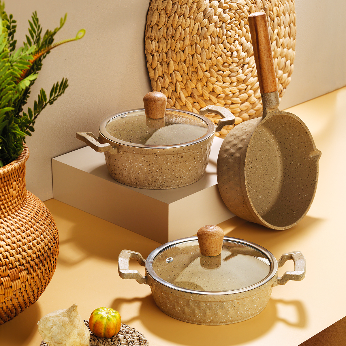 Granit malzeme, hem dayanıklılığı hem de uzun ömürlü kullanım sağlamasıyla öne çıkar. Isıyı dengeli dağıtma özelliği ile yemekler eşit şekilde pişer.