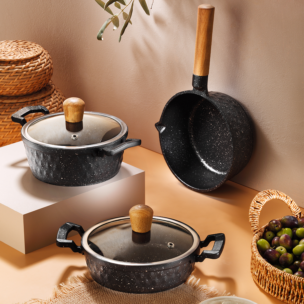 Granit malzeme, hem dayanıklılığı hem de uzun ömürlü kullanım sağlamasıyla öne çıkar. Isıyı dengeli dağıtma özelliği ile yemekler eşit şekilde pişer.