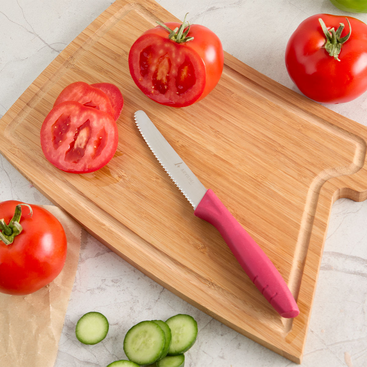 Aryıldız Primo domates bıçağı, mutfakta zarafet ve işlevselliği bir araya getirir. 10 cm uzunluğundaki paslanmaz çelik bıçağı, özellikle domates gibi kabuğu ince ve içi sulu sebzeleri kolayca dilimlemenizi sağlar. İnce ve keskin ucu, meyve ve sebzeleri ezmeden pürüzsüz kesim yapmanıza yardımcı olur.