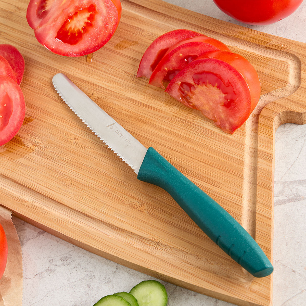 Aryıldız Primo domates bıçağı, mutfakta zarafet ve işlevselliği bir araya getirir. 10 cm uzunluğundaki paslanmaz çelik bıçağı, özellikle domates gibi kabuğu ince ve içi sulu sebzeleri kolayca dilimlemenizi sağlar. İnce ve keskin ucu, meyve ve sebzeleri ezmeden pürüzsüz kesim yapmanıza yardımcı olur.
