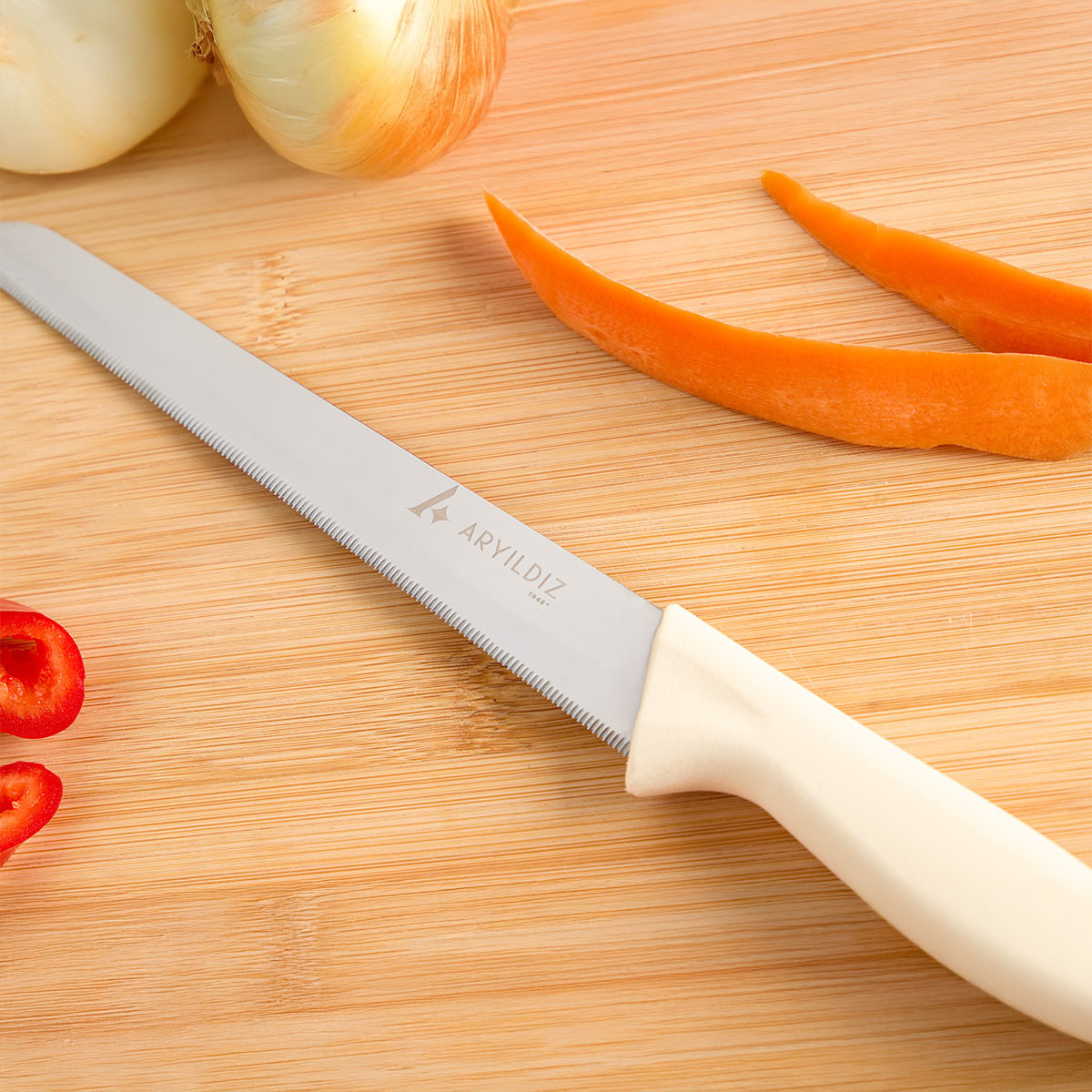 Yüksek kaliteli çelikten üretilen bıçak kısmı, uzun ömürlü kullanım için paslanmaya ve aşınmaya karşı dirençlidir. Tırtıklı ağız yapısı, hem taze hem de kabuğu sert ekmeklerde mükemmel performans sunar. Simit, baget, sandviç ekmeği veya tost ekmeği fark etmeksizin her kesimde pürüzsüz sonuç elde edilir.