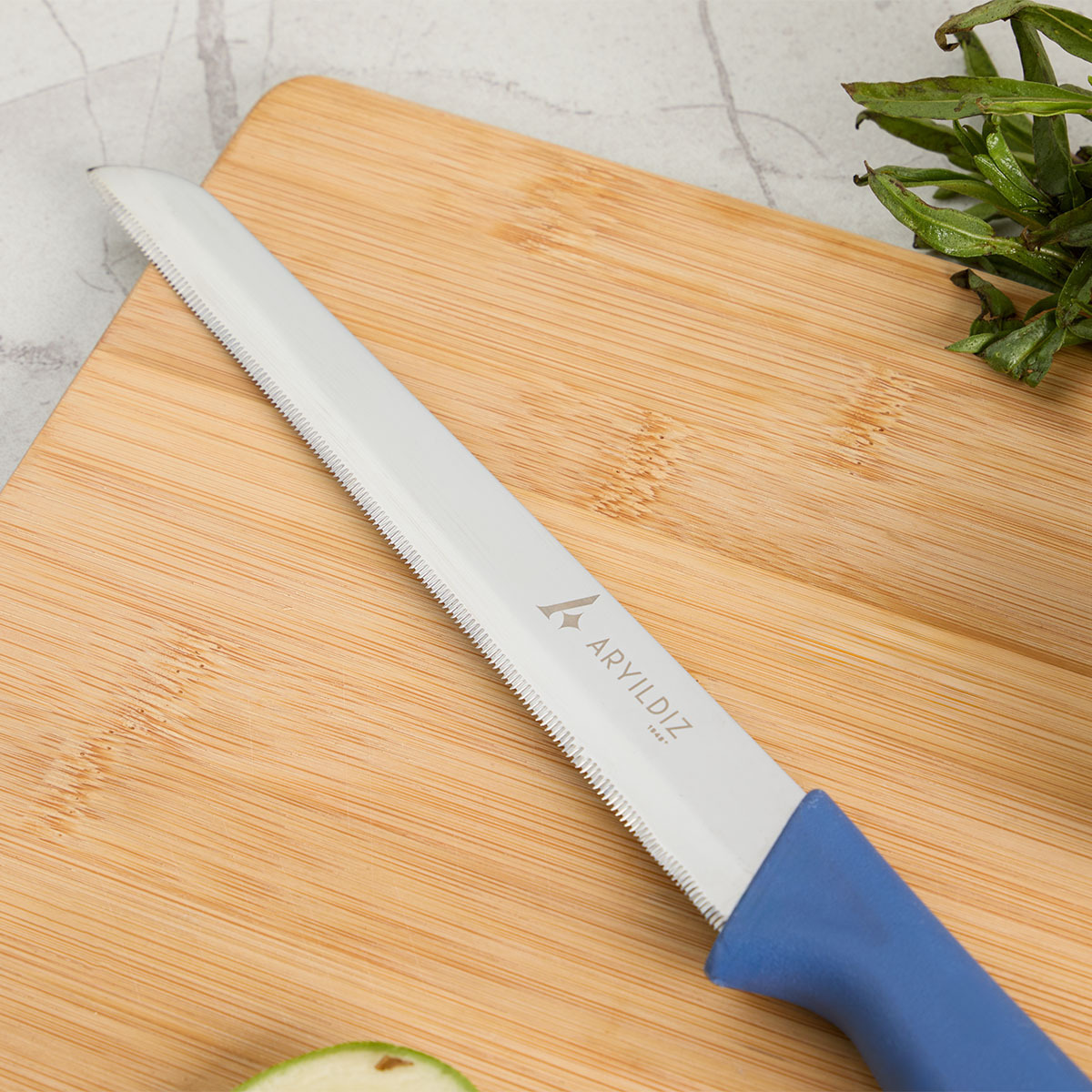 Aryıldız Primo Lazer Ekmek Bıçağı, mutfakta ustalıkla hazırlanmış kesimlerin sırrı olan keskinlik, dayanıklılık ve şıklığı bir araya getirir. 17 cm uzunluğundaki paslanmaz çelik bıçak, özel lazer teknolojisiyle tırtıklı bir forma sahiptir. Bu yapı sayesinde ekmeği ezmeden, kırıntı oluşturmadan ve dağılmadan kolayca kesmenizi sağlar.
