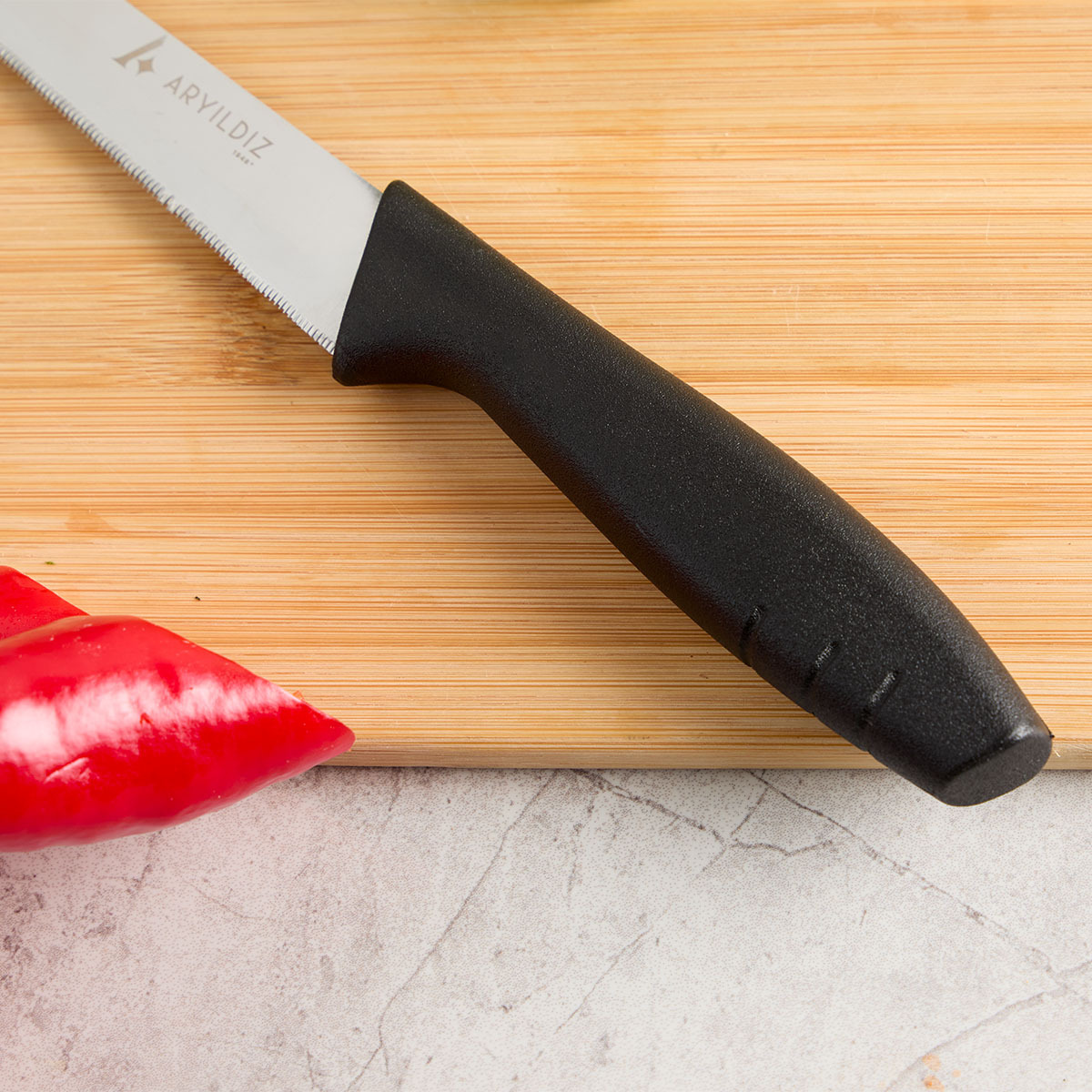 Ergonomik sap tasarımı, elinize tam oturarak güvenli ve rahat bir kullanım sağlar. Kaymaz yüzeyi, ıslak elle bile bıçağın kontrolünü kolaylaştırır. Modern ve sade tasarımı, Aryıldız’ın Primo serisine özgü zarafetle birleşerek mutfağınıza estetik bir dokunuş katar.