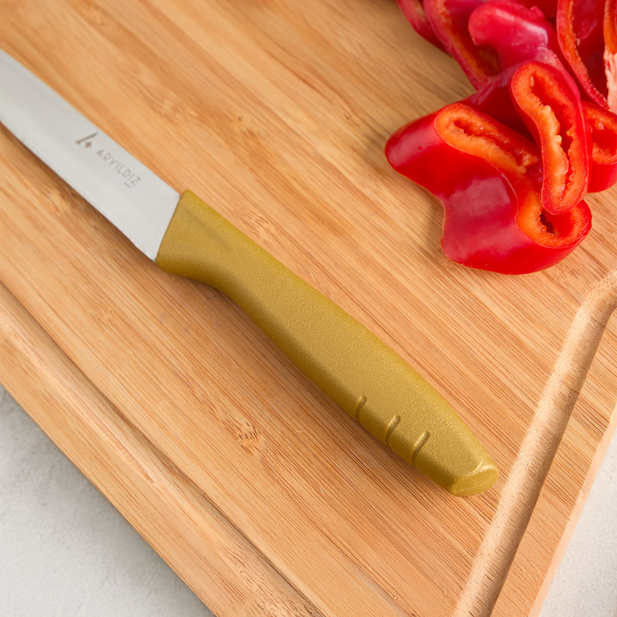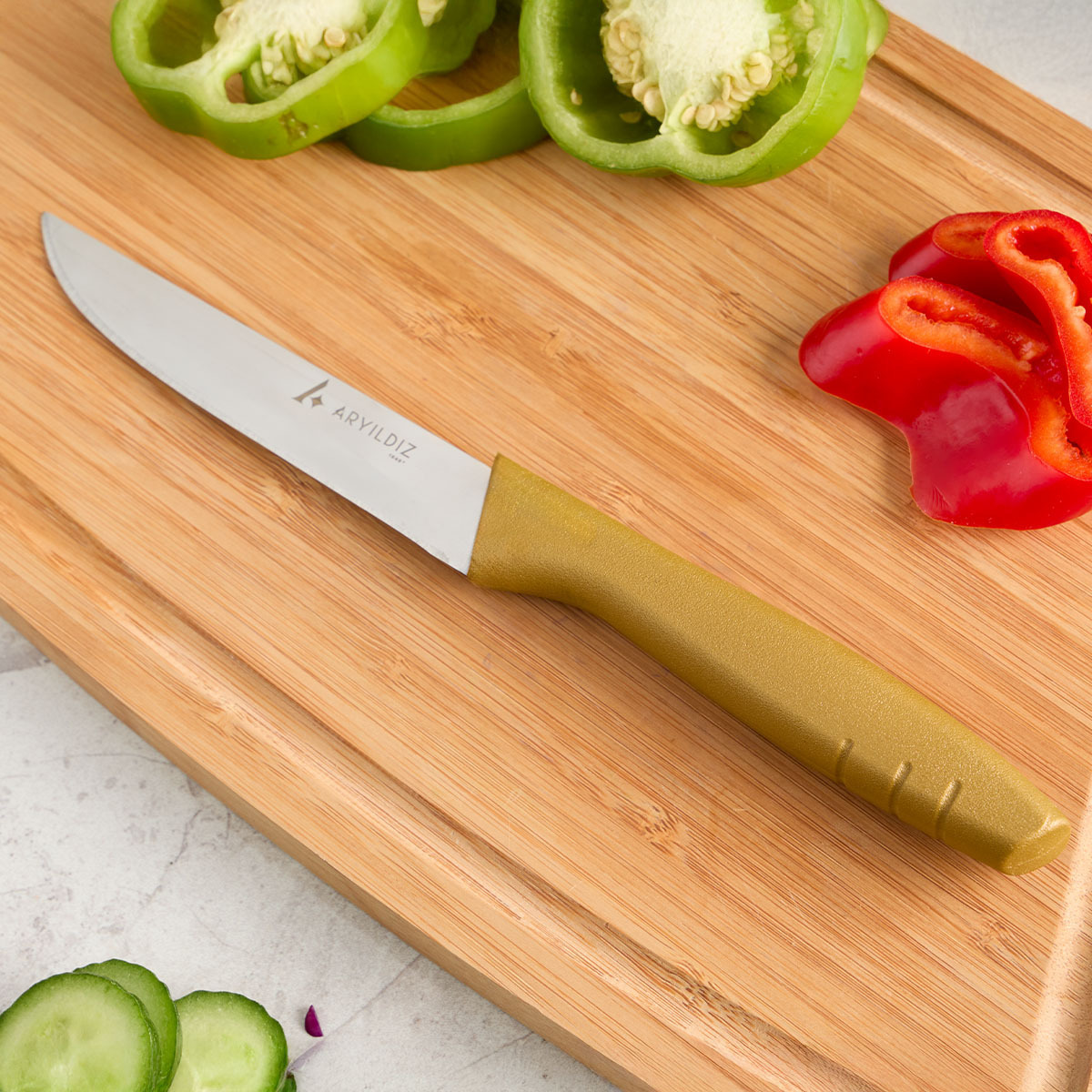 Mutfağınızda hem şıklığı hem de profesyonel performansı bir arada sunan Aryıldız Primo Sebze Bıçağı, zarif Gold rengiyle estetiği ön plana çıkarıyor.