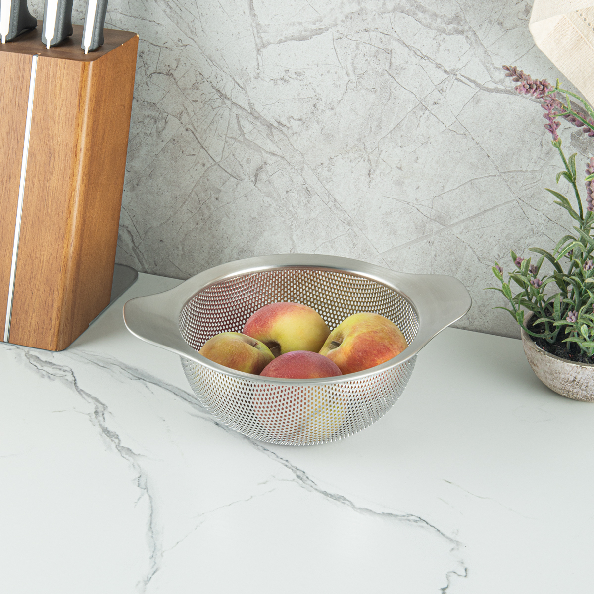 Paslanmaz çelikten üretilmiş olan bu süzgeç sepet, modern ve sade tasarımıyla her mutfağa uyum sağlar.