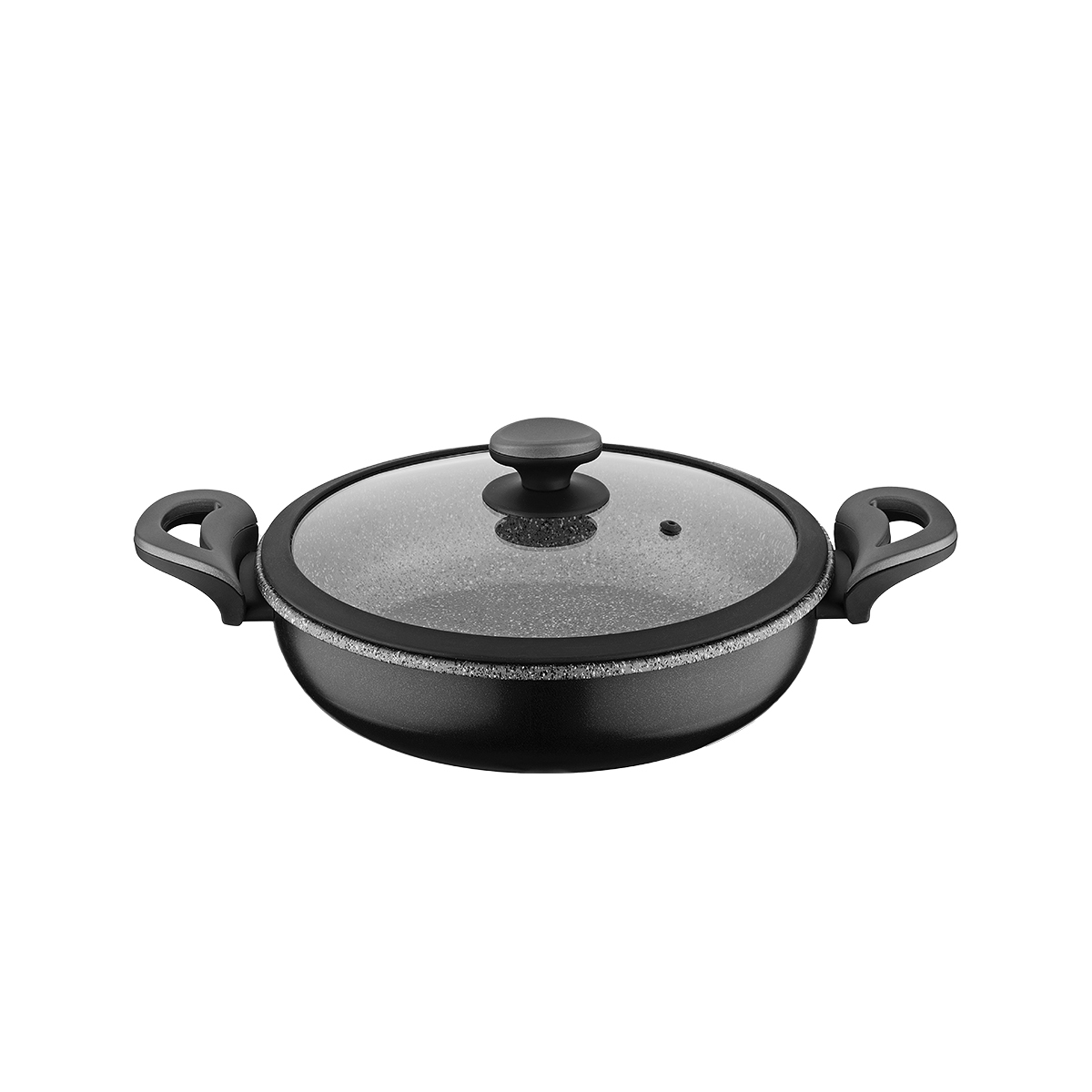 Granit kaplamalı tencereleri ile sağlıklı ve yapışmaz pişirme deneyimi sunarken, ısıya dayanıklı silikon servis setiyle yemek hazırlığınızı kolaylaştırır.