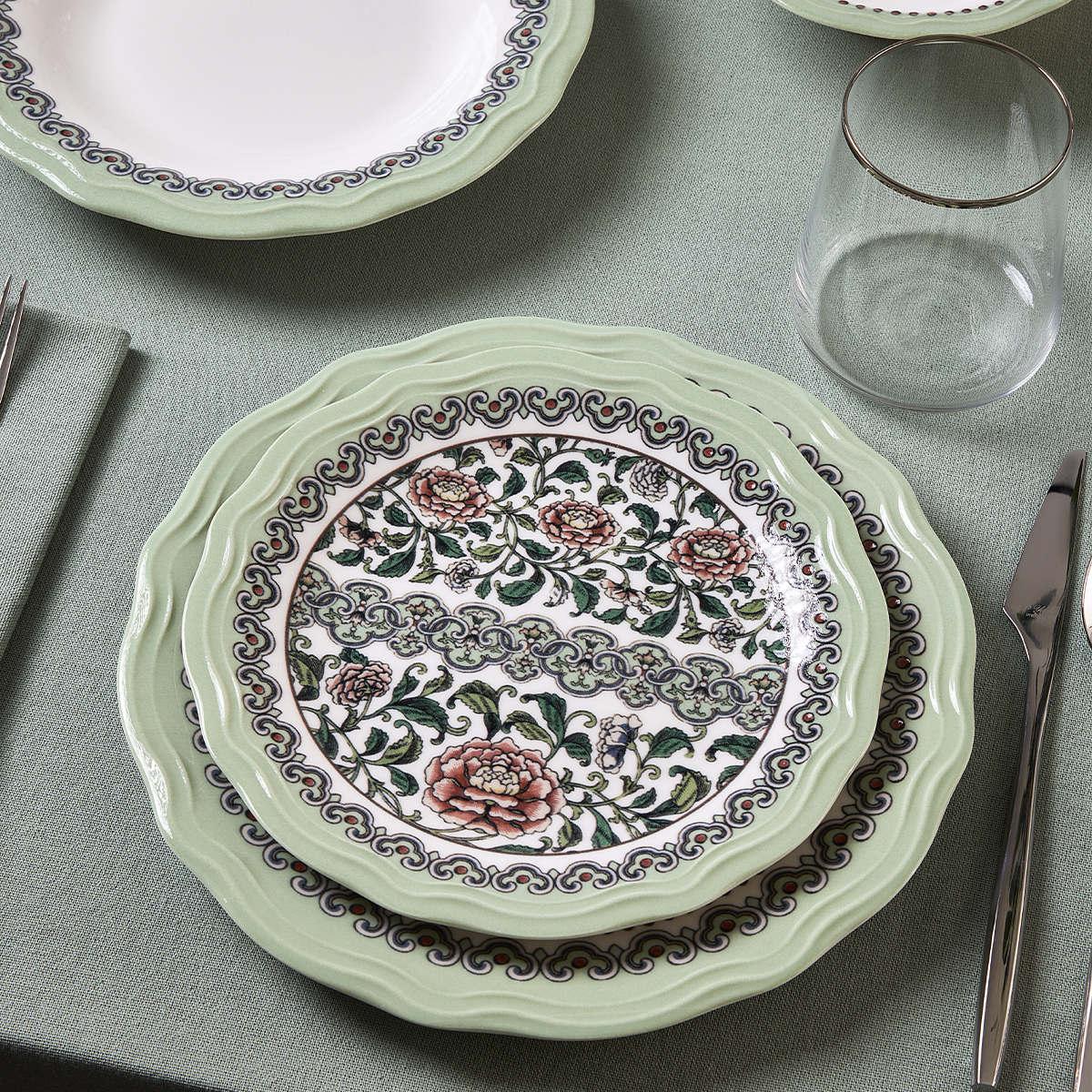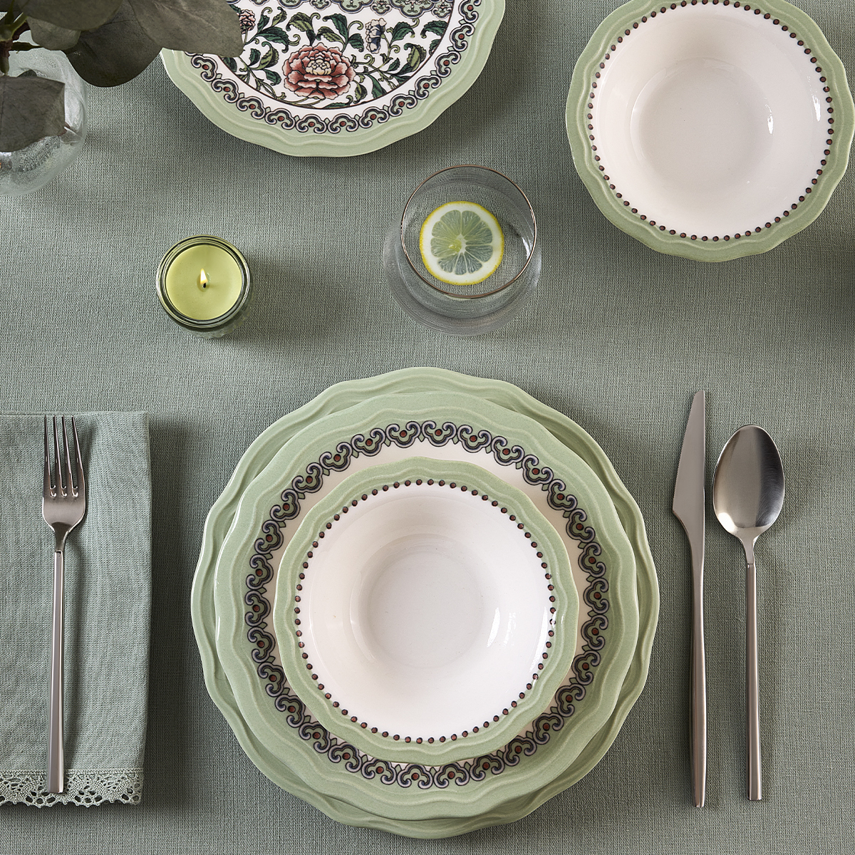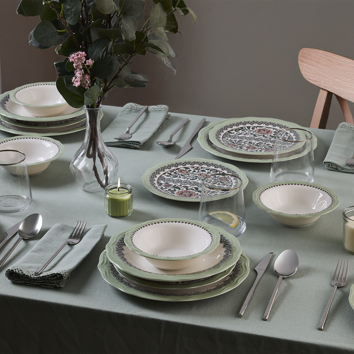 Rosa serisine özgü şık detaylar, sofralara yumuşak ve romantik bir hava katar.