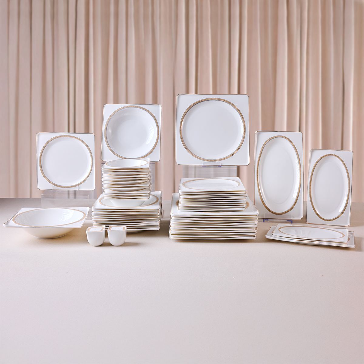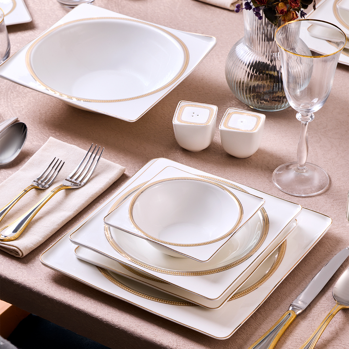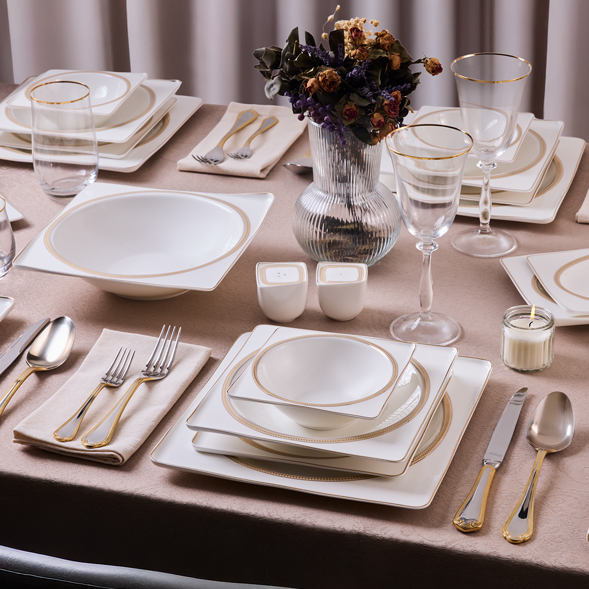 Zarafeti modern çizgilerle harmanlayan 56 Parça Yemek Takımı, geniş aile veya misafir ağırlamayı sevenler için tasarlanmış özel bir koleksiyondur.