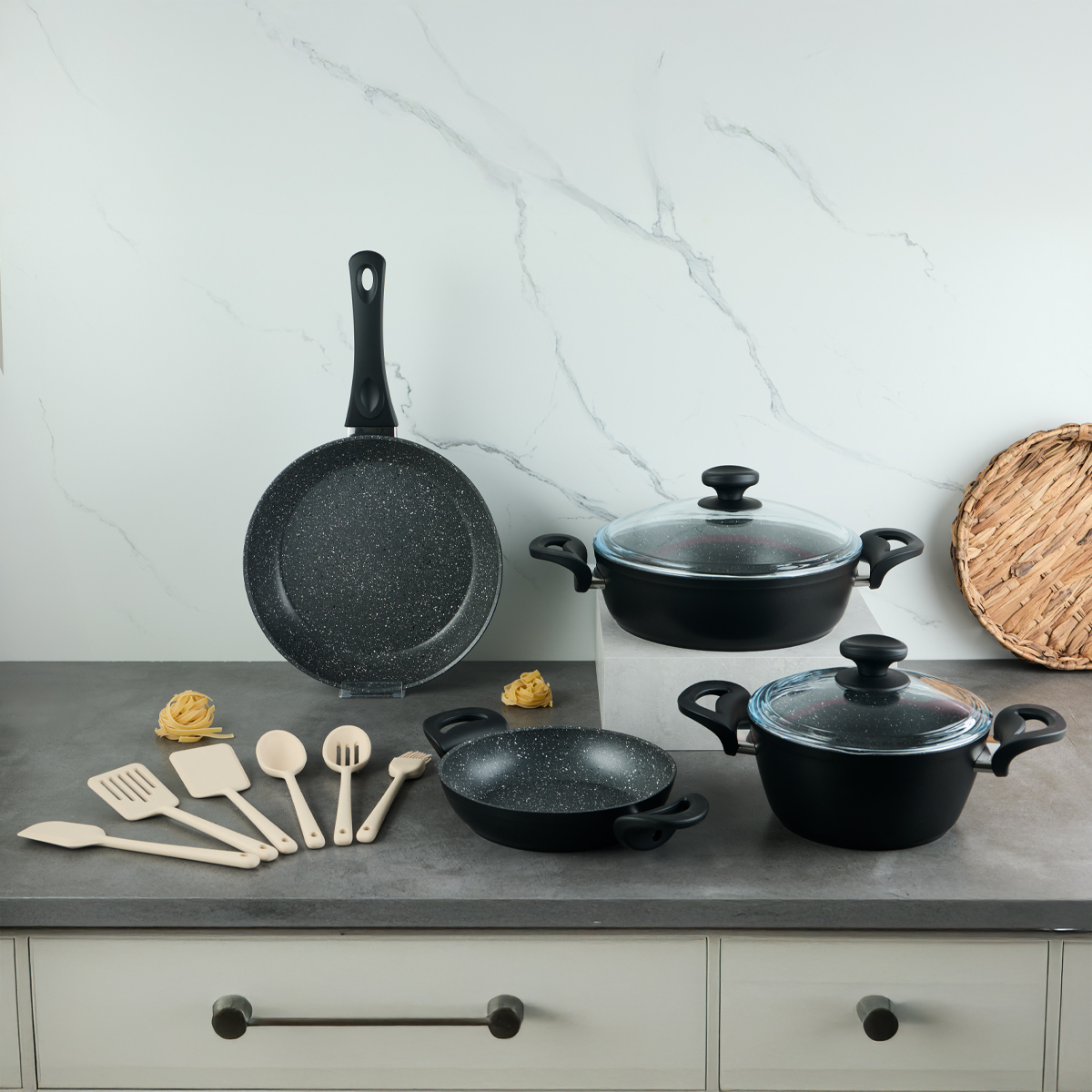 Mutfakta şıklık ve işlevselliği bir arada sunan bu özel set, günlük kullanım için ihtiyacınız olan her şeyi bir araya getiriyor. Granit kaplamalı tencereleri ile sağlıklı ve yapışmaz pişirme deneyimi sunarken, ısıya dayanıklı silikon servis setiyle yemek hazırlığınızı kolaylaştırır.