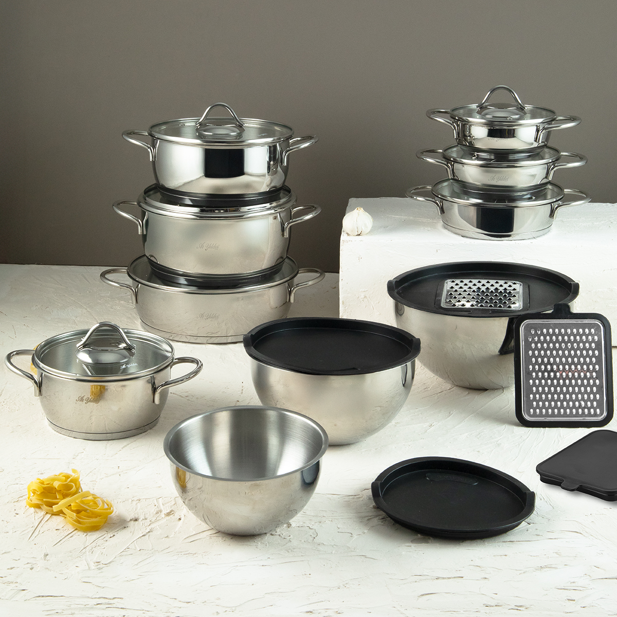 Aryıldız Soho Sahan Seti yüksek kalite paslanmaz çelik gövdesi ve kapsül tabanı ile ısıyı tüm yüzeylere eşit bir şekilde yayarak yemeklerinizin proteinlerini kaybetmeden pişmelerini sağlamaktadır.