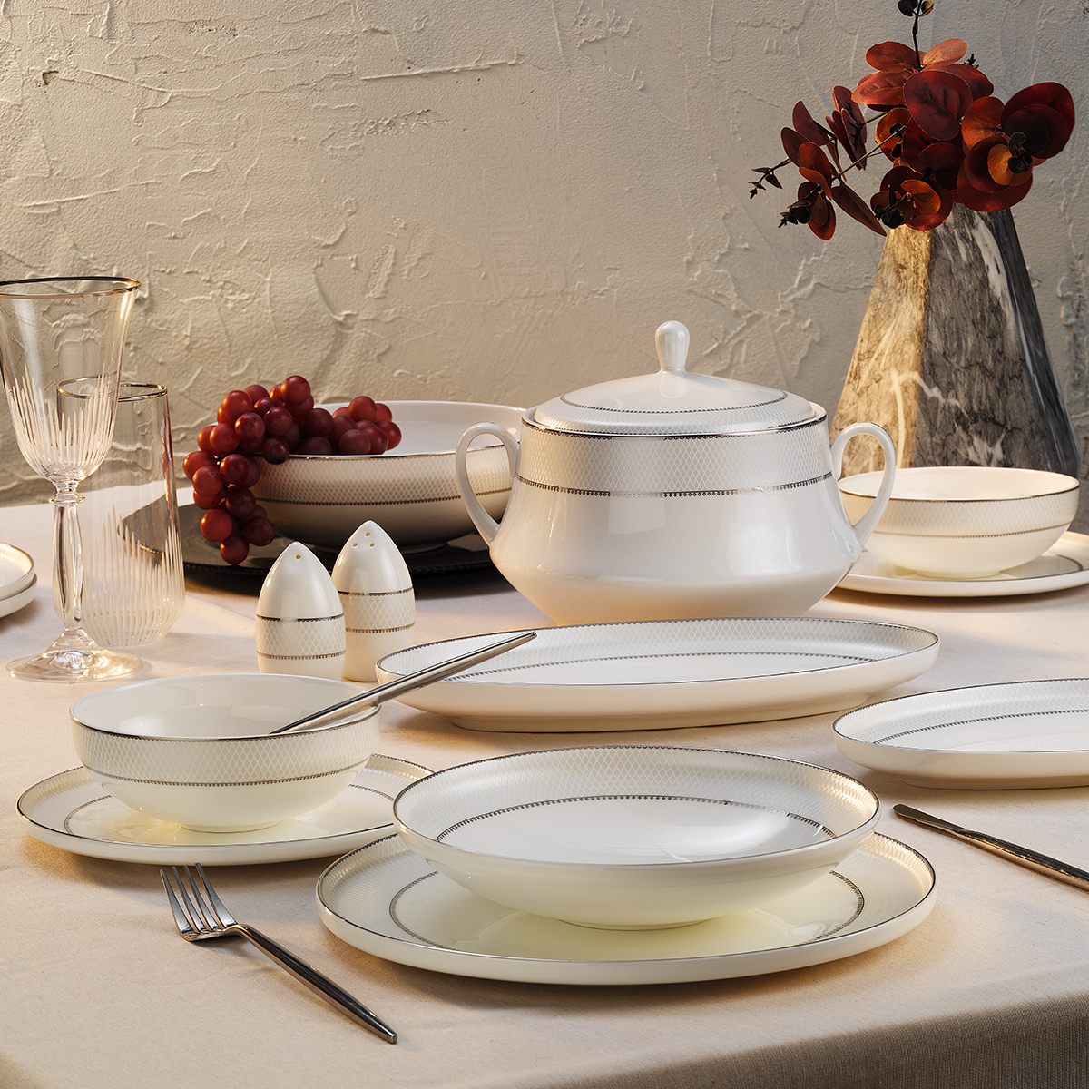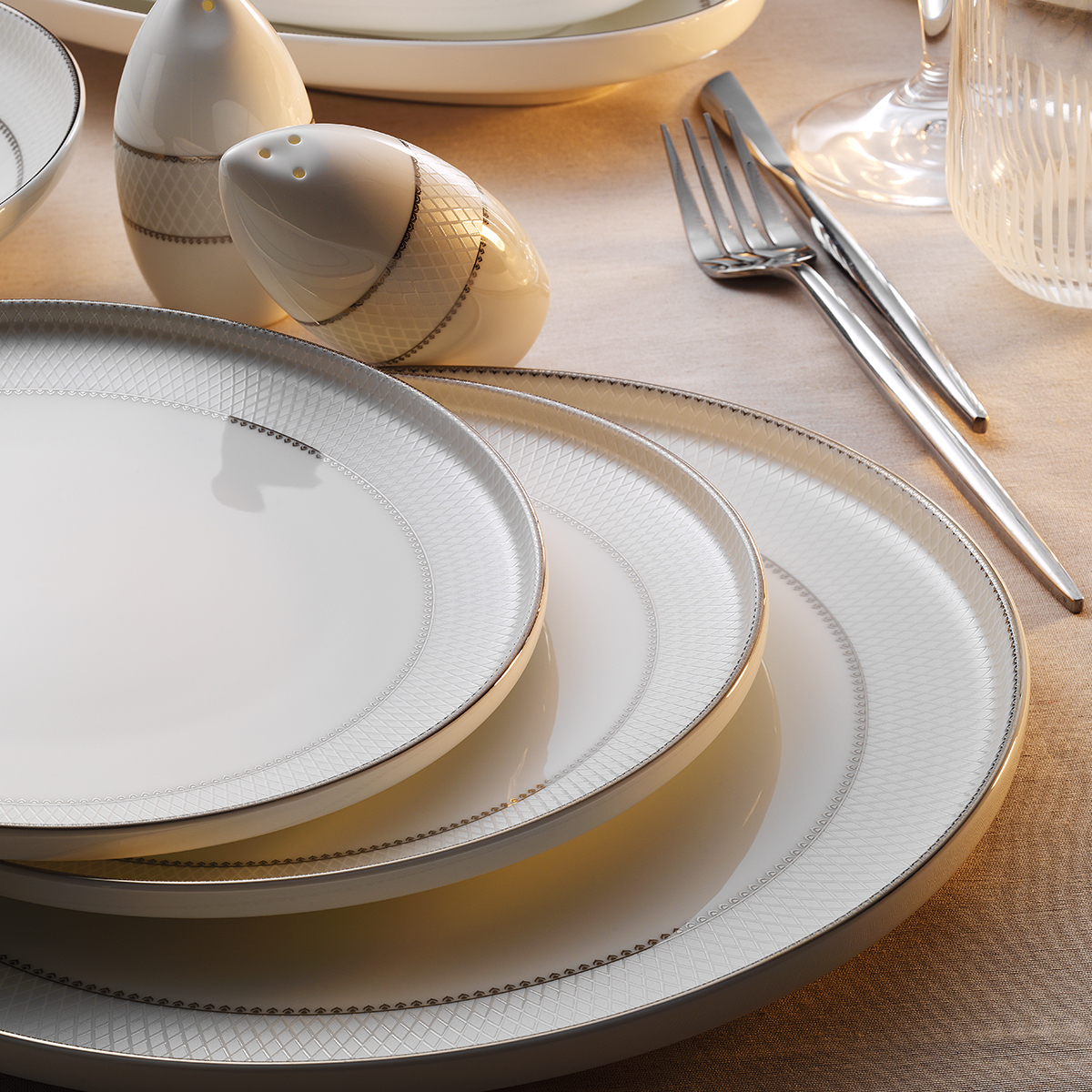 Aryıldız Vanessa Platin 60 Parça Yemek Takımı, modern çizgilerle klasik zarafeti birleştiren göz alıcı bir koleksiyon sunuyor.