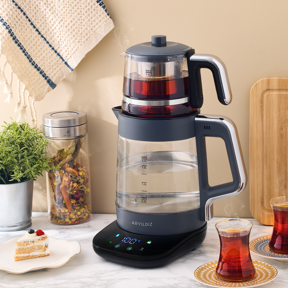 Modern mutfak dekorasyonları ile uyumlu tasarımı, kolay temizlenebilir yüzeyi ve fonksiyonel özellikleriyle Aryıldız Vision , günlük çay keyfinizi pratik ve şık bir deneyime dönüştürür.