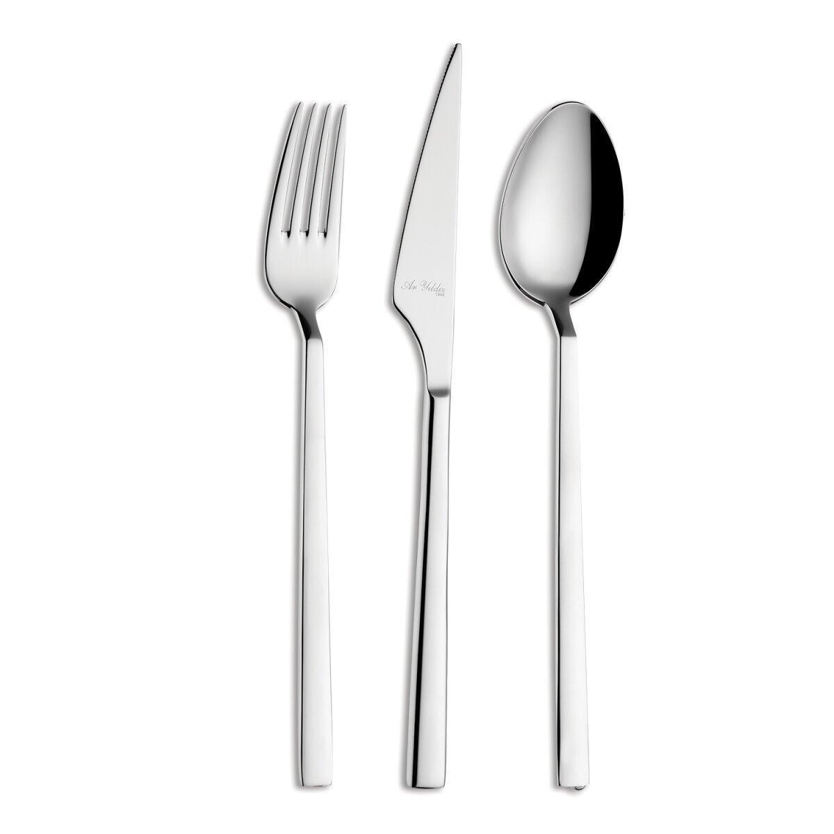 Aryıldız Vogue 36 Parça Çatal Kaşık Bıçak Seti, yansıtıcı gövdesi, zamansız tasarım çekiciliği ve her dekorla uyum sağlayan parlak bir yüzey sunan zarif, stilize bir çizgiyle vurgulanmıştır.